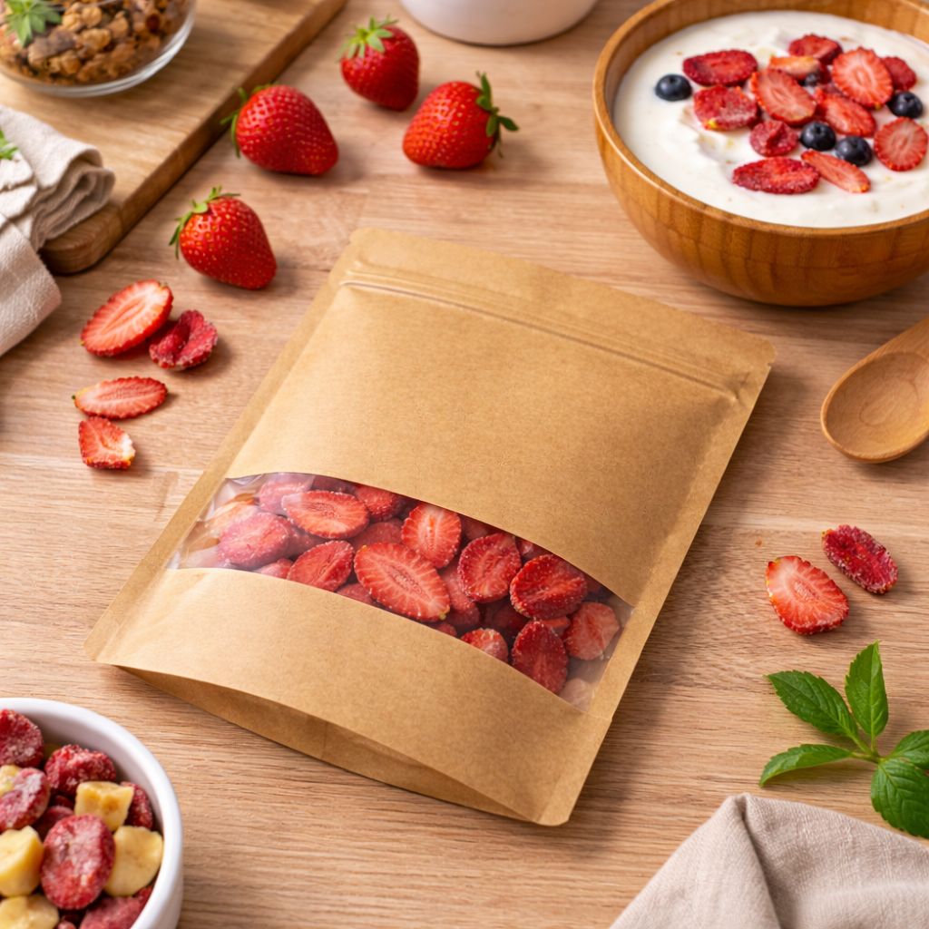 Papierowe woreczki strunowe typu doypack wyposażone są w solidne zamknięcie strunowe, umożliwiające wielokrotne otwieranie i szczelne zamykanie. Stabilne dno pozwala na estetyczne ustawienie saszetek w punktach sprzedaży, a naturalny papier kraft podkreśla dbałość o ekologię oraz wysoką jakość pakowanego produktu.
