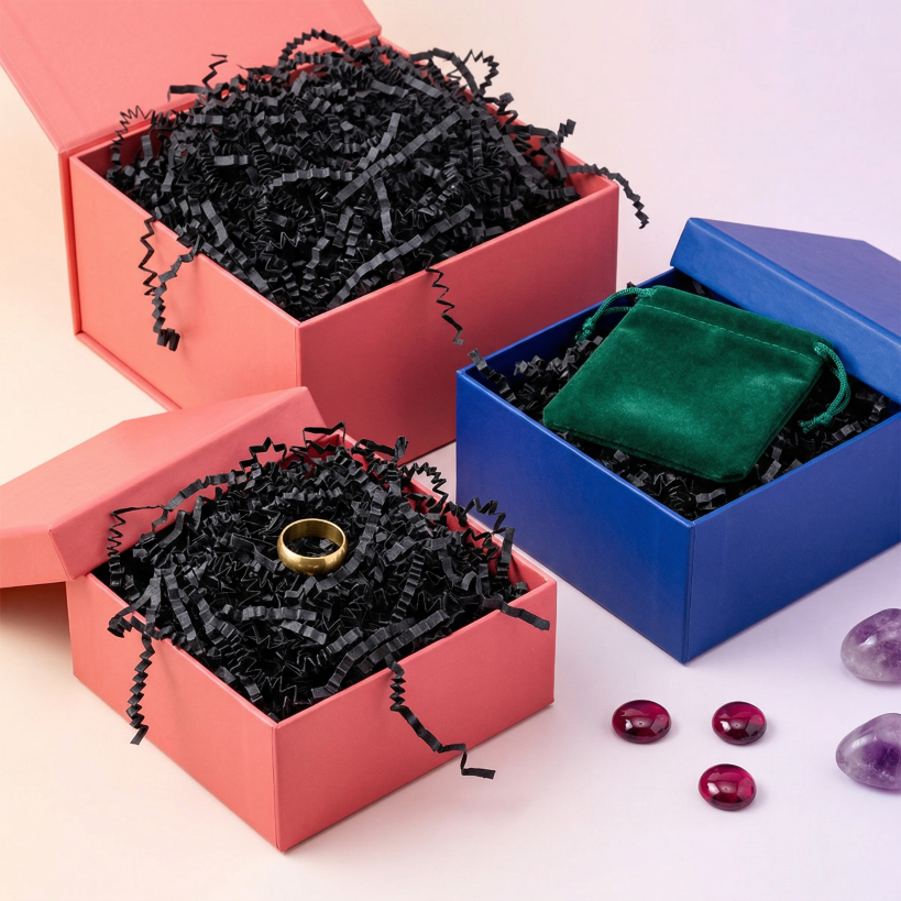 Wypełniacz papierowy w formie wiórek to elegancki i uniwersalny dodatek do pakowania prezentów oraz zabezpieczania produktów. Sprężysta struktura wiórek skutecznie amortyzuje zawartość, chroniąc ją przed przemieszczaniem i uszkodzeniami podczas transportu.